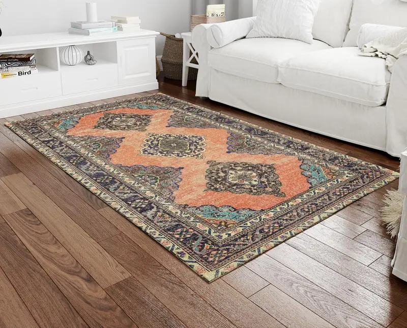 Alfombra con estampado vintage floral naranja y verde, detalles en marrón
