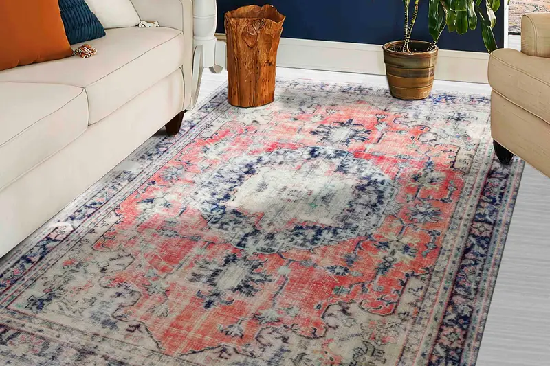 Alfombra estampada vintage con medallones en azul marino y diseño floral antiguo