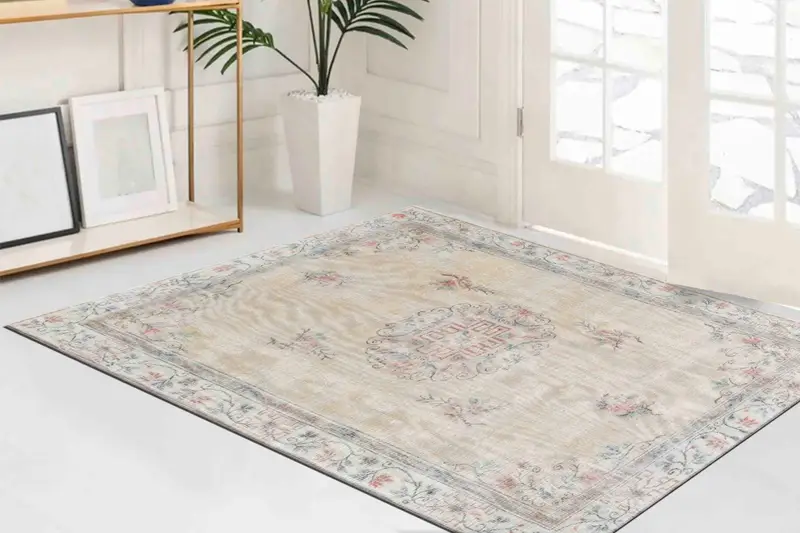 Alfombra estampada vintage beige con estampado floral y tonos suaves
