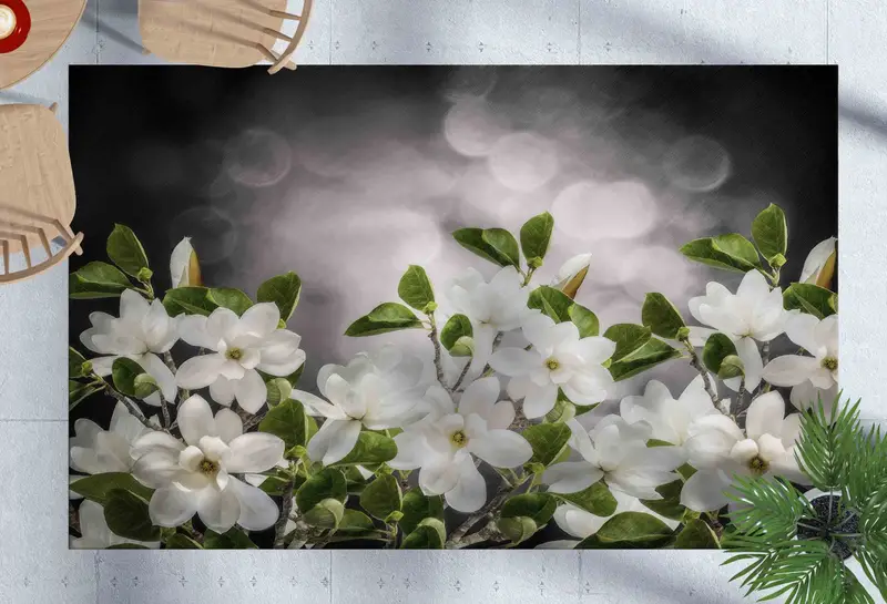 Alfombra con estampado de flores de magnolia: decoración moderna de una granja esencial