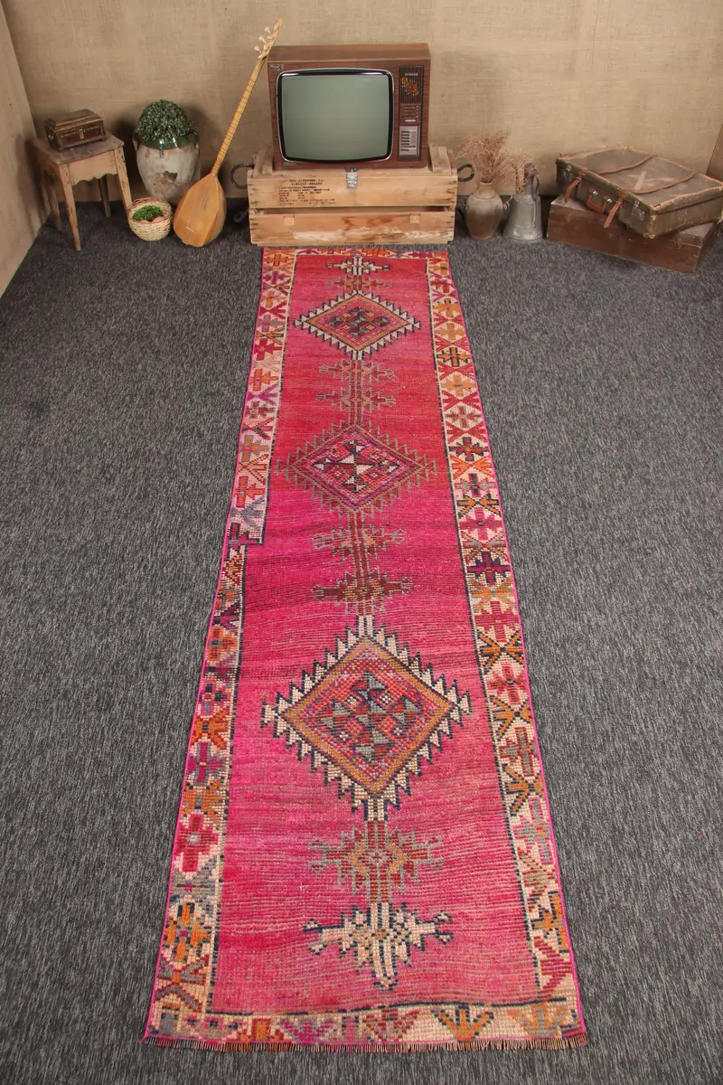 Alfombra turca vintage 3x11,3 pies (90x345 cm), alfombra geométrica rosa Herki