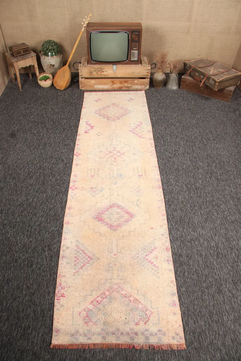 Alfombra turca vintage 2,8x10,5 pies (86x321 cm), alfombra geométrica rosa beige Herki