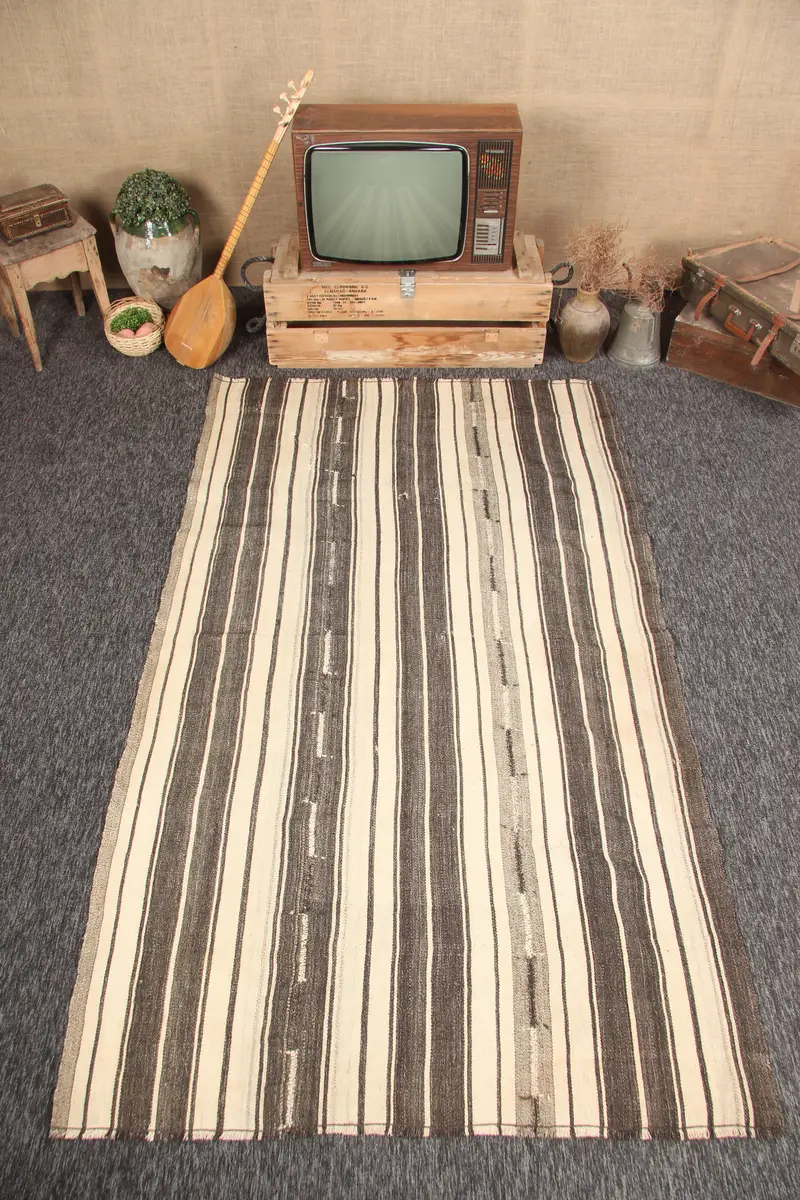 Alfombra turca vintage de 4,6x7,9 pies, alfombra a rayas marrón beige