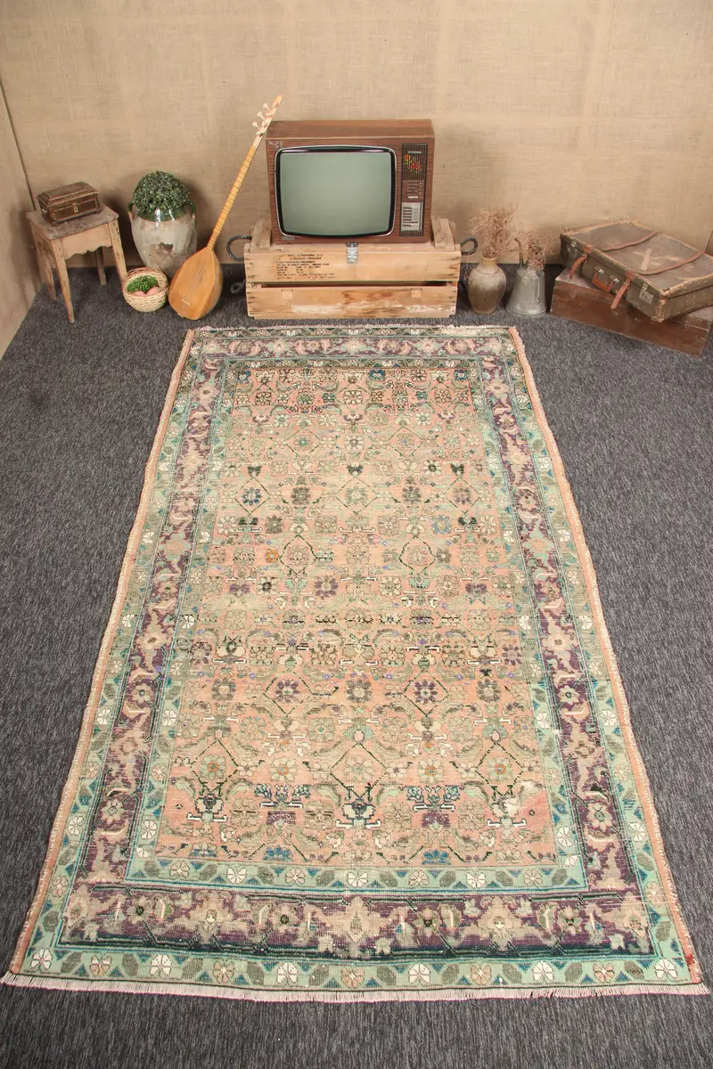 Alfombra turca vintage de 5,1x9,4 pies, alfombra geométrica verde con elementos florales