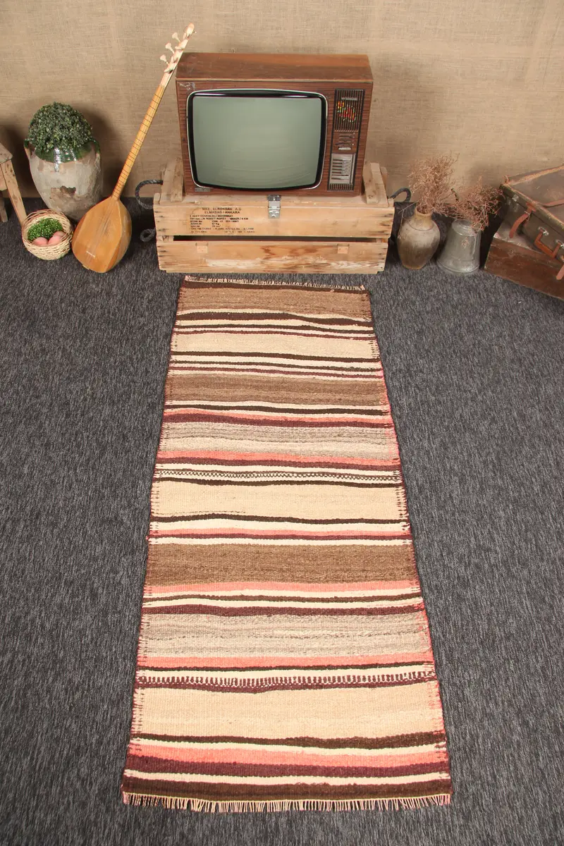 Alfombra vintage de 2,8x6,4 pies, alfombra turca pequeña, alfombra a rayas marrón beige