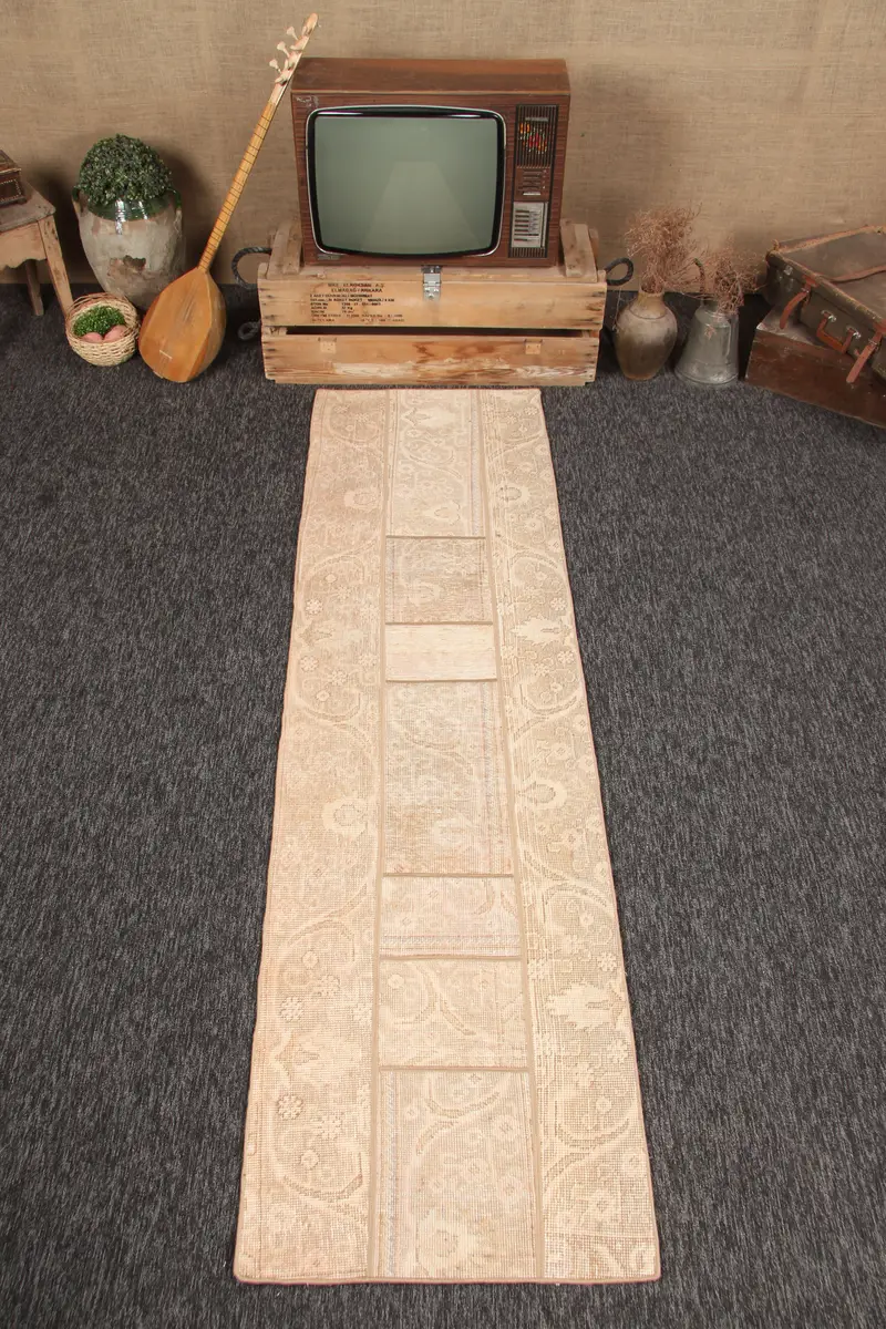 Alfombra vintage turca, alfombra patchwork de 2,2x8 pies, alfombra geométrica verde beige con elementos florales