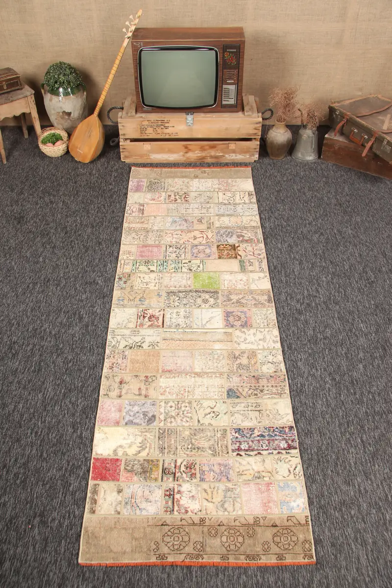 Alfombra turca de 2,8x8,6 pies, alfombra vintage patchwork, alfombra geométrica beige con elementos florales