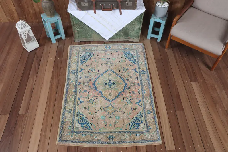 Alfombra turca pequeña de 3,3x4,7 pies, geométrica azul con elementos florales Alfombra vintage