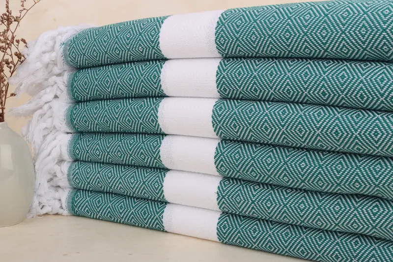 Toalla de playa turca con monograma de diamante verde oscuro, beige, algodón orgánico, 40 x 71 pulgadas