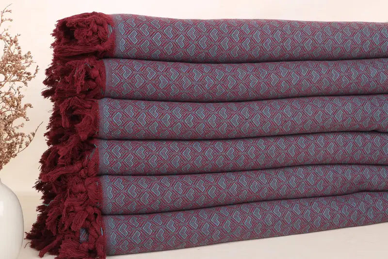 Manta estilo boho de algodón color turquesa oscuro y burdeos, 75 x 87 pulgadas