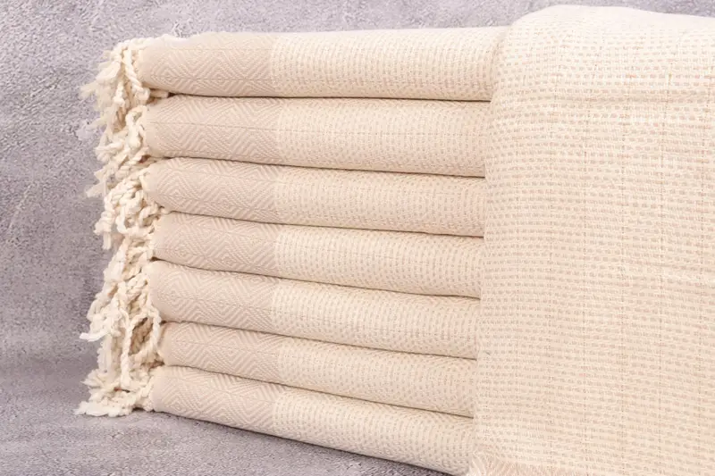 Estas toallas se caracterizan por su composición de fibra de algodón turco de primera calidad, lo que garantiza una alta absorbencia y durabilidad. Las telas se tejen a mano, lo que da como resultado dimensiones de 40x71 pulgadas o 100x180 centímetros con una tolerancia de 2 pulgadas o 5 centímetros debido a los métodos de tejido tradicionales. El peso de cada toalla es precisamente de 380 gramos, lo que ofrece un equilibrio entre portabilidad liviana y cobertura sustancial.