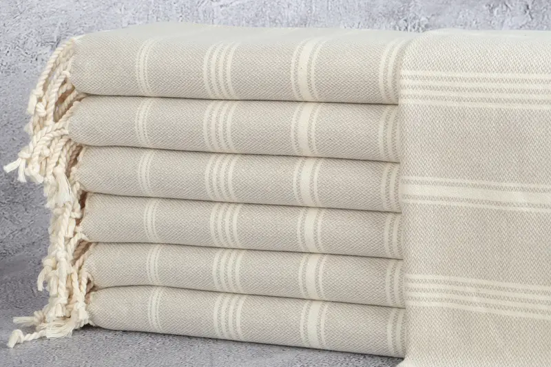 El algodón turco orgánico caracteriza las lujosas toallas, asegurando una alta absorbencia y durabilidad. Estas toallas, que dan como resultado un producto ligero pero robusto, están tejidas de forma plana y se pueden utilizar por ambos lados. Las dimensiones especificadas son 24x38 pulgadas o 60x95 centímetros, con una tolerancia de hasta 5 cm debido a las técnicas tradicionales de tejido a mano.