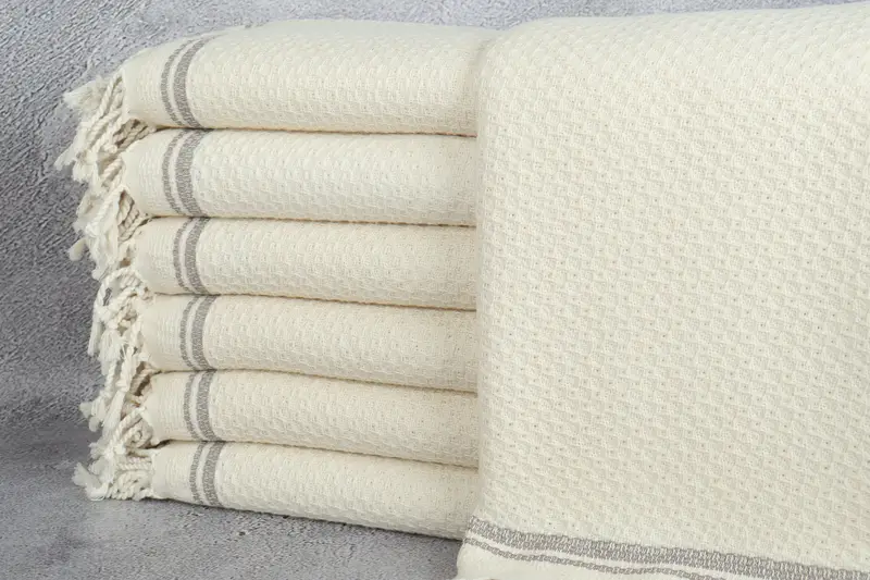 El algodón turco es reconocido por su alta calidad y durabilidad, asegurando un tacto suave y sedoso. La composición de fibra da como resultado una absorbencia excepcional, lo que hace que estas toallas sean ideales para una variedad de usos. Estas toallas tejidas a mano, que miden 36x67 pulgadas o 90x170 centímetros, pesan 440 gramos y tienen una tolerancia de tejido a mano de hasta 5 cm. Cada pieza está elaborada con precisión, lo que da como resultado un producto consistente y confiable.