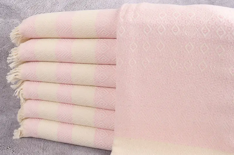 Toalla de playa turca de algodón orgánico rosa claro, diamante, 40 x 71 pulgadas