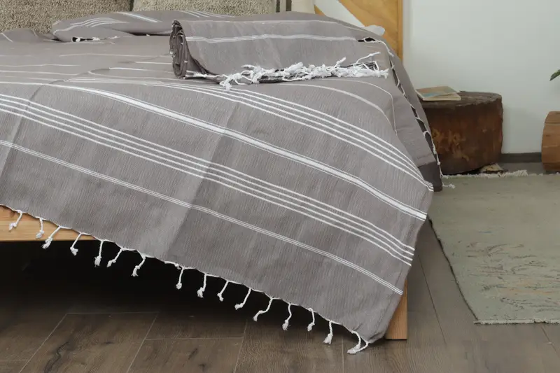 Manta para sofá de algodón turco orgánico, rayas marrones y beige, 63 x 91 pulgadas