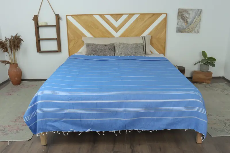 Manta de rayas azul y beige saxofón tejida a mano, 63 x 91 pulgadas