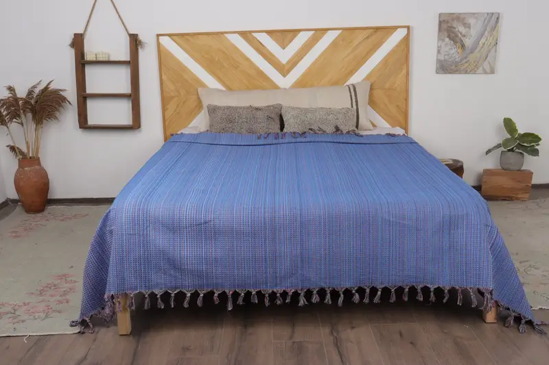 Colcha tejida a mano a rayas azules del Parlamento, 87 x 91 pulgadas