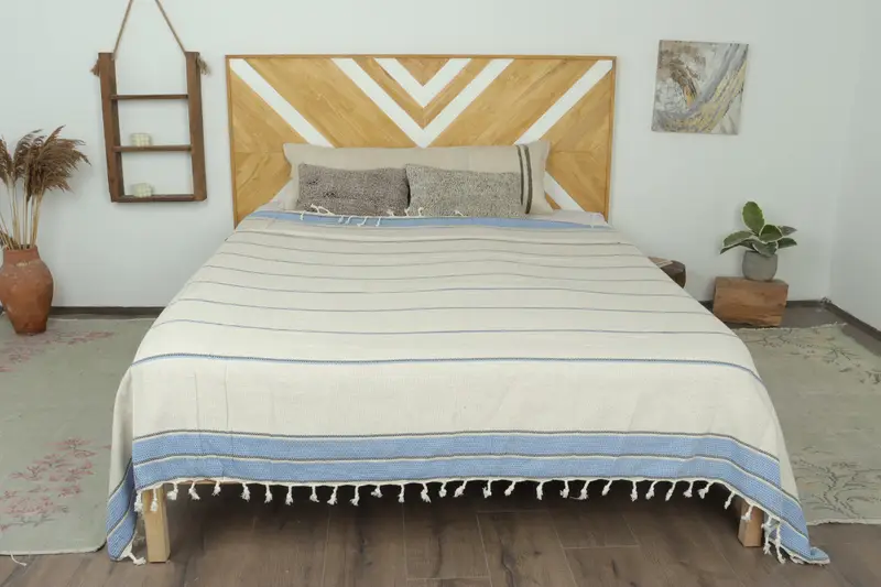 Manta para sofá de algodón turco orgánico con rayas azules, 95 x 103 pulgadas