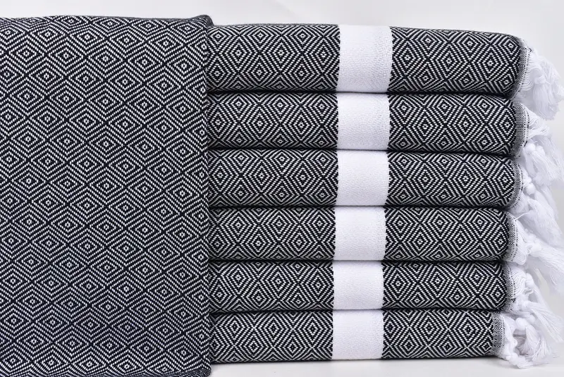 Las fibras de algodón turco de primera calidad garantizan una excepcional absorción de agua y una capacidad de secado rápido. Como resultado, las toallas son livianas, aproximadamente 100 gramos, y exhiben variaciones de tejido a mano de hasta 2,5 cm. Las dimensiones son estándar de 18x40 pulgadas o 45x100 cm.