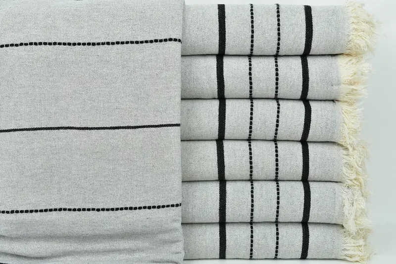 Para confeccionar estas toallas se utiliza algodón turco de primera calidad, caracterizado por su excelente absorbencia, lo que garantiza un secado rápido y versatilidad. Las toallas miden 40x71 pulgadas (100x180 cm), con un peso aproximado de 460 gramos. El tejido a mano da como resultado una tolerancia de tamaño de 1-2,5 cm.