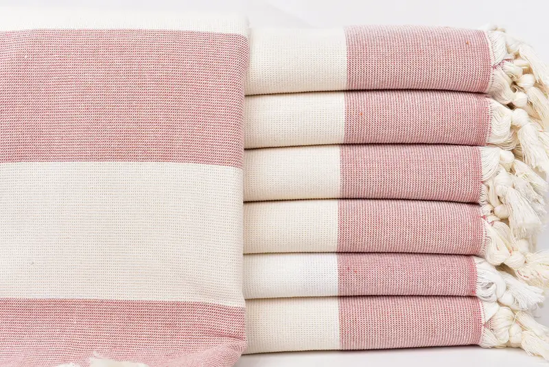 Las toallas de algodón turco se caracterizan por su alta absorbencia y secado rápido, lo que garantiza una absorción eficiente del agua y una necesidad mínima de equipo de secado. El peso del material es de alrededor de 400 gramos y el tamaño estándar es de 36x71 pulgadas o 90x180 cm con una tolerancia de 1-2,5 cm. Cada pieza está meticulosamente tejida a mano en telares tradicionales turcos.