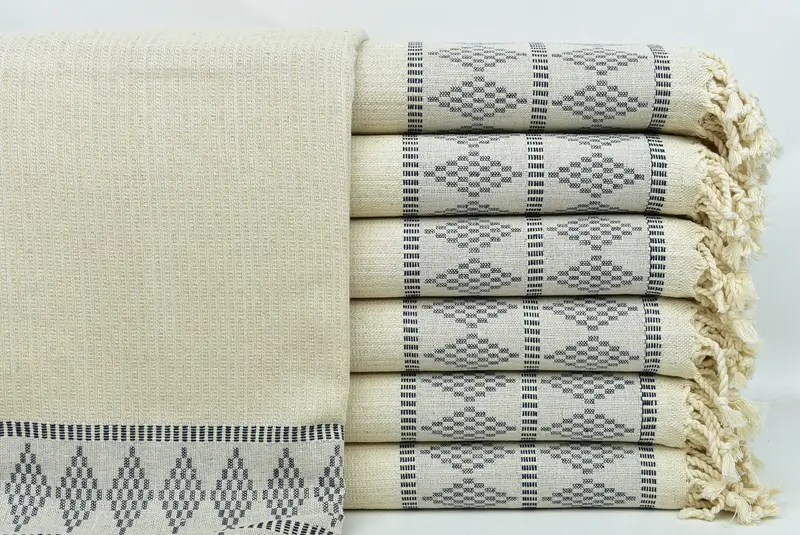Las fibras de algodón turco de primera calidad caracterizan estas toallas, lo que garantiza una absorbencia superior y propiedades de secado rápido. Cada toalla, que pesa aproximadamente 480 gramos, está meticulosamente tejida a mano en telares tradicionales turcos con tolerancias de hasta 2,5 cm de dimensiones. Al ofrecer servicios de bordado personalizables, estas toallas están preencogidas para brindar la máxima comodidad. Las dimensiones de las toallas son 36x71 pulgadas (90x180 cm) con posibles variaciones de tamaño de 1 a 2,5 cm.