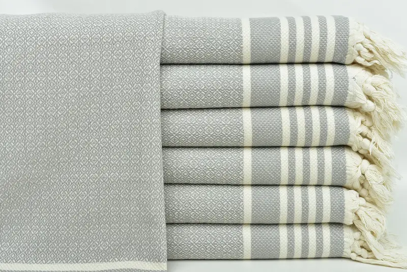 El algodón turco de primera calidad, caracterizado por su absorbencia superior, garantiza una absorción eficaz del agua y un secado rápido. Dando como resultado una textura ligera y suave, este material es ideal para paños de cocina y de cocina. Estas toallas, que miden 40 x 80 cm (16 x 32 pulgadas) con una tolerancia de 1 a 2,5 cm, pesan alrededor de 100 gramos.
