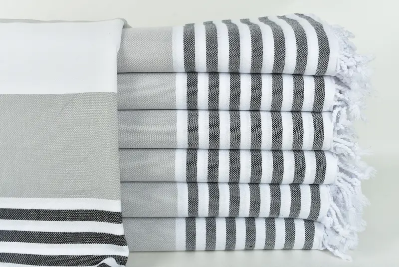 El algodón turco de primera calidad garantiza una absorción superior, lo que da como resultado tiempos de secado rápidos. Se caracteriza por unas dimensiones de 40x71 pulgadas (100x180 cm) con una tolerancia de 1-2,5 cm y un peso que ronda los 280 gramos. El tejido en telar manual contribuye a ligeras variaciones de tamaño.