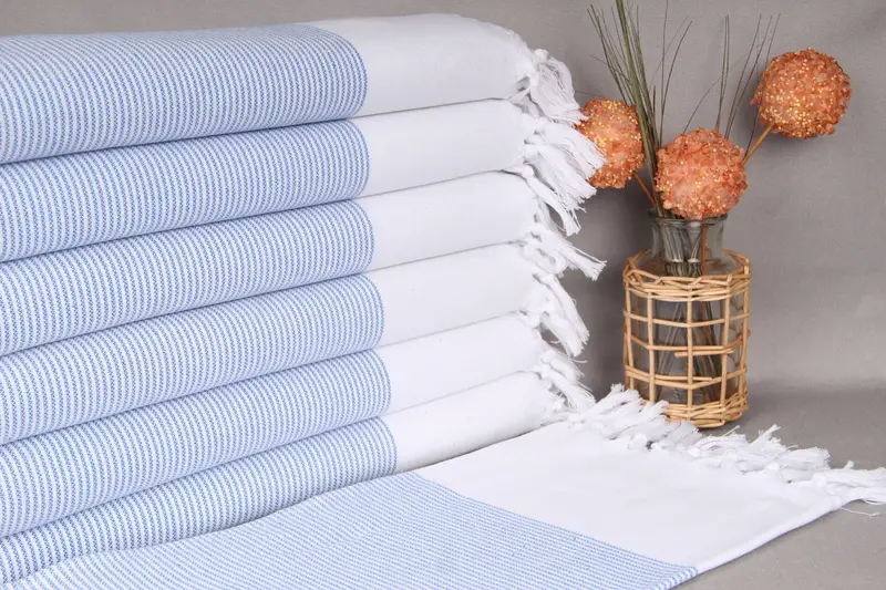 Toalla de cocina bordada Sax Blue Stripes Algodón orgánico, 18x40 pulgadas