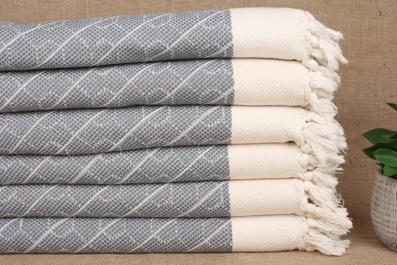 Fibra de algodón orgánico puro, que garantiza una absorbencia excepcional y un secado rápido. Caracterizada por unas dimensiones de 18x36 pulgadas o 45x90 centímetros, la toalla de mano turca pesa aproximadamente 120 gramos. Las tolerancias de tejido pueden variar hasta ±2 pulgadas o 5 centímetros.