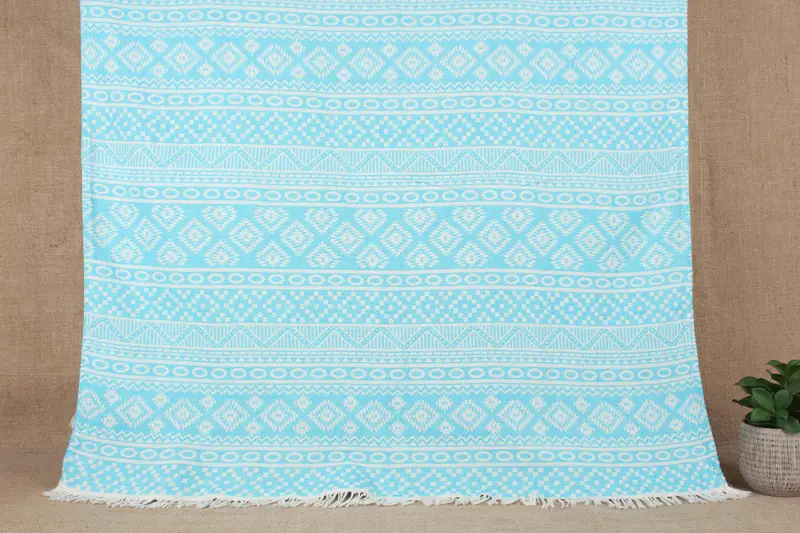 La toalla de playa turca está compuesta de algodón orgánico puro, lo que garantiza absorbencia y secado rápido. Sus dimensiones son 36x67 pulgadas (90x170 cm), con un peso aproximado de 320 gramos. Las tolerancias de tejido manual pueden ser de hasta ±2 pulgadas o 5 cm.