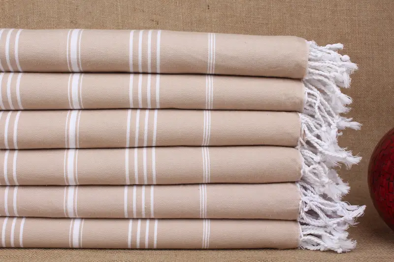 La toalla de playa turca se caracteriza por su composición de puro algodón orgánico, asegurando una alta absorbencia y un secado rápido. Con un peso aproximado de 280 gramos, sus dimensiones son 40x71 pulgadas (100x180cm) con una tolerancia de tejido de ±2 pulgadas (±5cm). El tamaño y la densidad de la toalla están influenciados por el meticuloso proceso de tejido a mano.