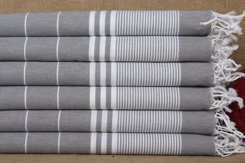 Las toallas turcas se caracterizan por su tejido de doble cara con puro algodón orgánico, lo que garantiza una alta absorbencia y un secado rápido. Las toallas, que miden 24x40 pulgadas o 60x100 cm, con una tolerancia de ±2" o 5 cm, pesan aproximadamente 120 gramos. Su tejido a mano da como resultado un estado preencogido, con una suavidad que aumenta después del lavado.