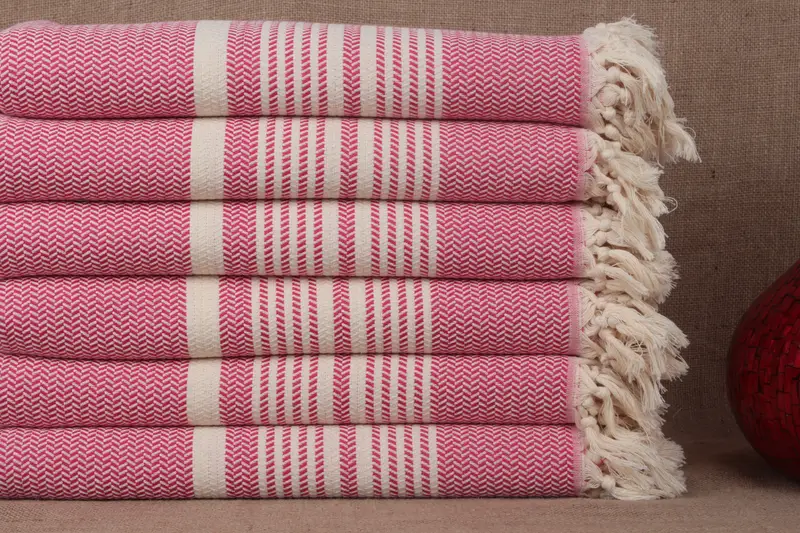 Compuestas principalmente de algodón orgánico, las toallas son reconocidas por sus propiedades absorbentes, lo que garantiza un secado rápido y una mayor utilidad. Caracterizada por unas dimensiones de 40x71 pulgadas o 100x180 centímetros, cada pieza pesa aproximadamente 420 gramos. El tejido manual da como resultado tolerancias de hasta ±2 pulgadas o 5 centímetros.
