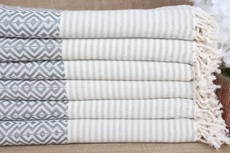 La toalla turca está confeccionada con algodón orgánico puro, lo que garantiza una alta absorbencia y un secado rápido. Caracterizada por su tejido de doble cara, la toalla tiene un tamaño de 38x75 pulgadas (95x190 cm) y un peso de aproximadamente 400 gramos. Las tolerancias de tejido pueden dar lugar a variaciones de tamaño de hasta ± 2 pulgadas (± 5 cm).
