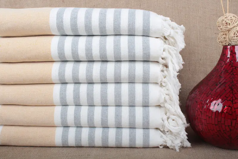 La toalla de playa turca, una variante de rayas personalizable, se caracteriza por su tejido ecológico de doble cara de puro algodón orgánico, lo que garantiza la máxima absorbencia y un secado rápido. Con unas dimensiones de 36 x 67 pulgadas (90 x 170 cm) y un peso aproximado de 380 gramos, este producto hecho a mano permite tolerancias de tejido de ±2 pulgadas (5 cm).