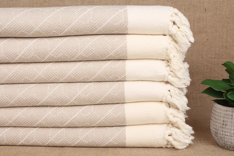 Las toallas de algodón orgánico se caracterizan por su alta absorbencia, asegurando un secado rápido. El uso de hilo de algodón turco da como resultado un peso de toalla de aproximadamente 120 gramos. Cada toalla hecha a mano tiene unas dimensiones de 18x36 pulgadas o 45x90 centímetros, con una tolerancia de ± 2 pulgadas o 5 centímetros debido a las técnicas de tejido manual.