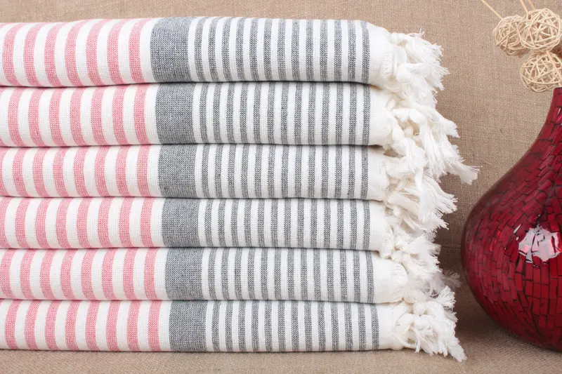 Las toallas turcas se caracterizan por su composición de puro algodón orgánico, asegurando una absorbencia excepcional y un secado rápido. Estas toallas miden 38x67 pulgadas (95x170 cm) y pesan aproximadamente 430 gramos. El tejido a mano da como resultado tolerancias de hasta 2 pulgadas o 5 cm.