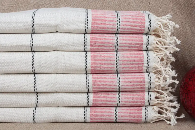 La toalla de mano se caracteriza por su construcción de punto de doble cara, confeccionada con puro algodón orgánico, lo que garantiza una alta absorbencia y un secado rápido. Dando como resultado una toalla de aproximadamente 20x40 pulgadas (50x100 cm) con una tolerancia de ±2 pulgadas (5 cm), su peso se sitúa en unos 120 gramos. Las tolerancias de tejido son inherentes a las toallas turcas hechas a mano, centrándose principalmente en la calidad y la funcionalidad.