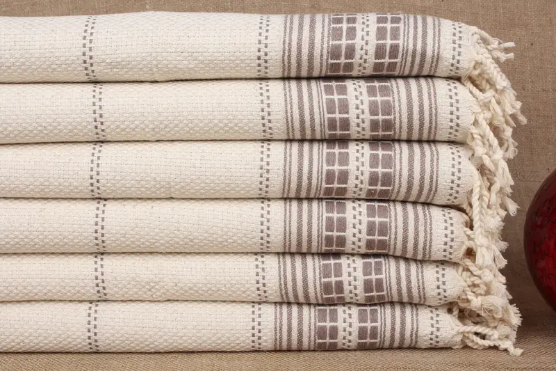 La toalla de mano se caracteriza por su composición de puro algodón orgánico, asegurando una alta absorbencia y un secado rápido. Sus dimensiones son 20x40 pulgadas o 50x100 centímetros, con un peso aproximado de 120 gramos. El proceso de tejido a mano da como resultado una tolerancia de ±2 pulgadas o 5 centímetros.