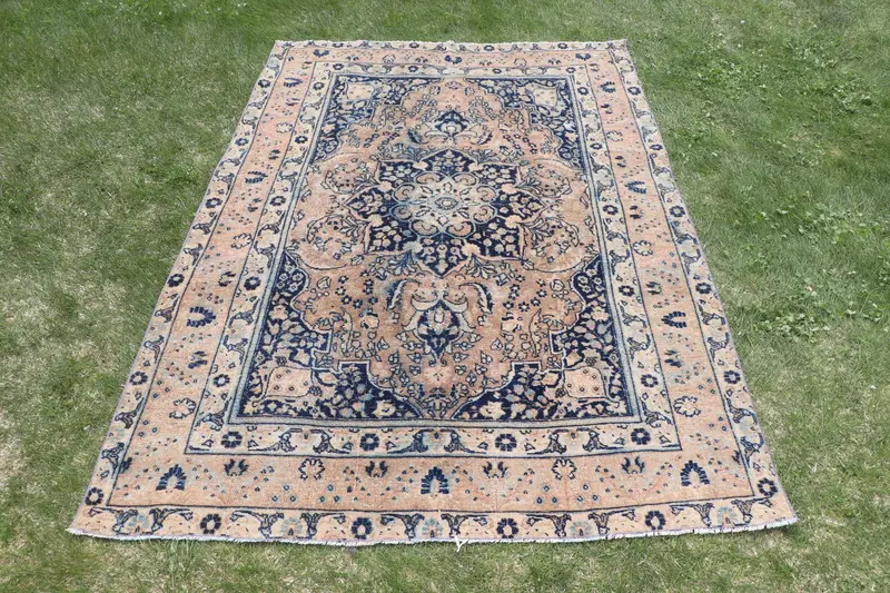 ブルーの抽象的なラグ、4.2x6.3フィート、オレ...
