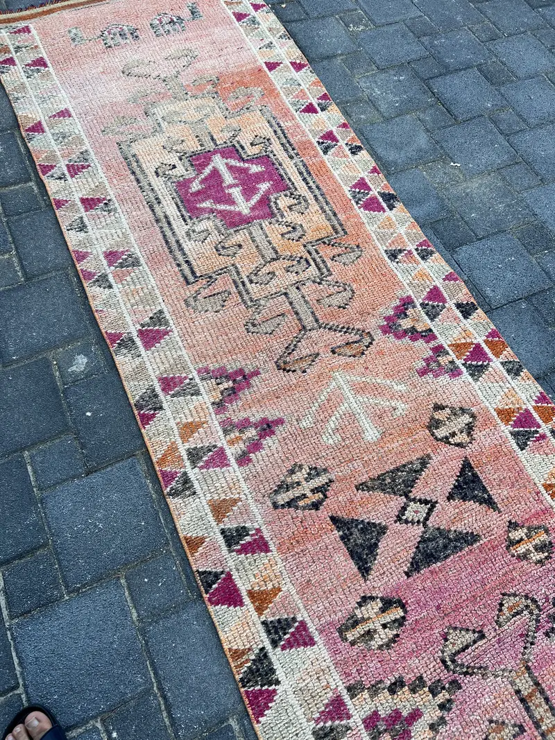 ピンクとパープルのラグ、2.9x10.6フィートの花柄の幾何学模様