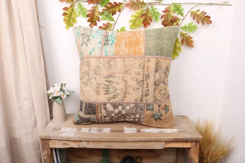 ベージュ & オレンジ パッチワーク クッション、ヴィンテージ刺繍クッション