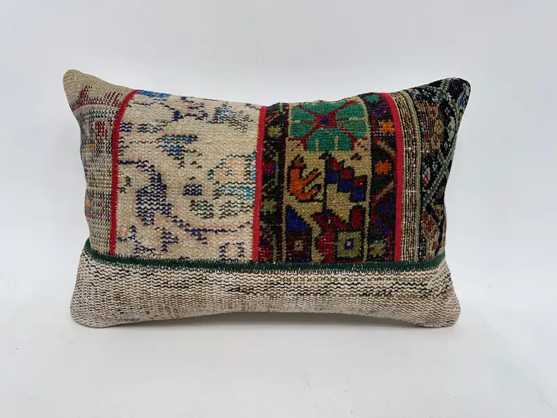 ベージュ & ブロンズ 16 x 24 刺繍パッチワーク クッション ヴィンテージ ハンドメイド クッション