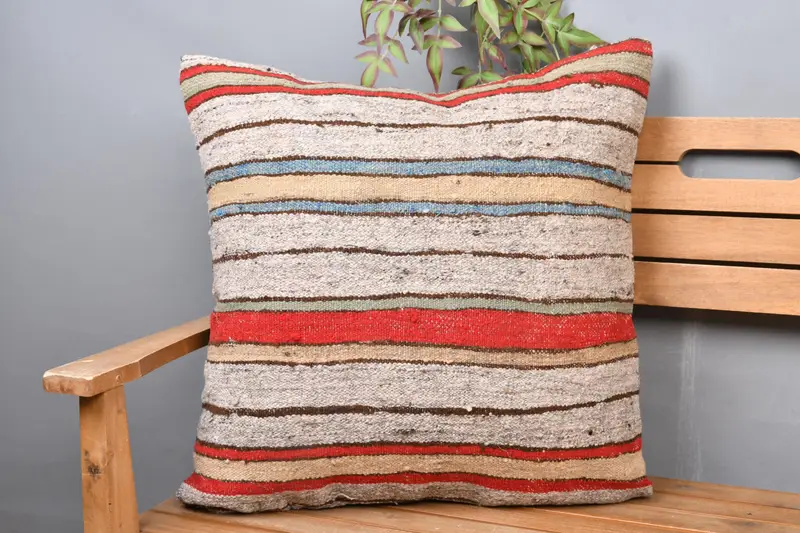 ベージュ & レッド ストライプ クッション、24 x 24 刺繍クッション