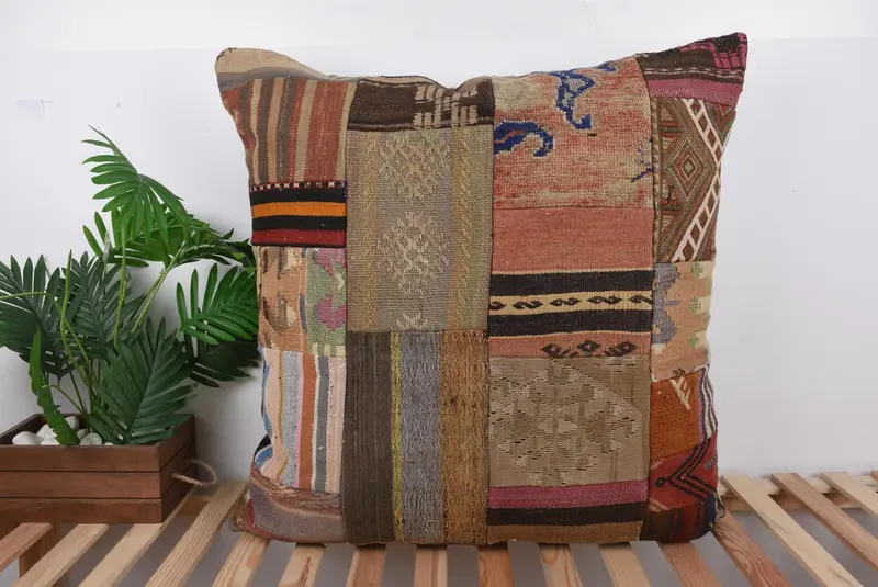 ベージュ & ブラウン パッチワーク クッション、...