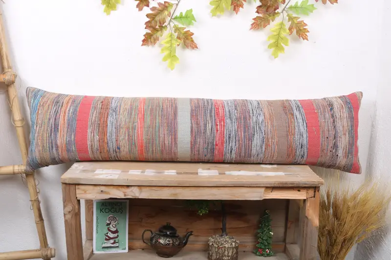 レッド&ブロンズの幾何学模様のリネンスローピロー、ハンドメイドのヴィンテージクッション