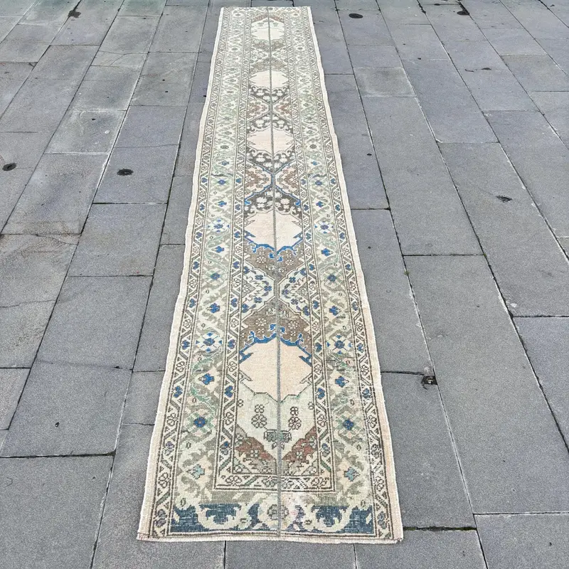 エレガントなベージュ & グリーン ラグ、2.1x12.1 フィート、自然をイメージした装飾