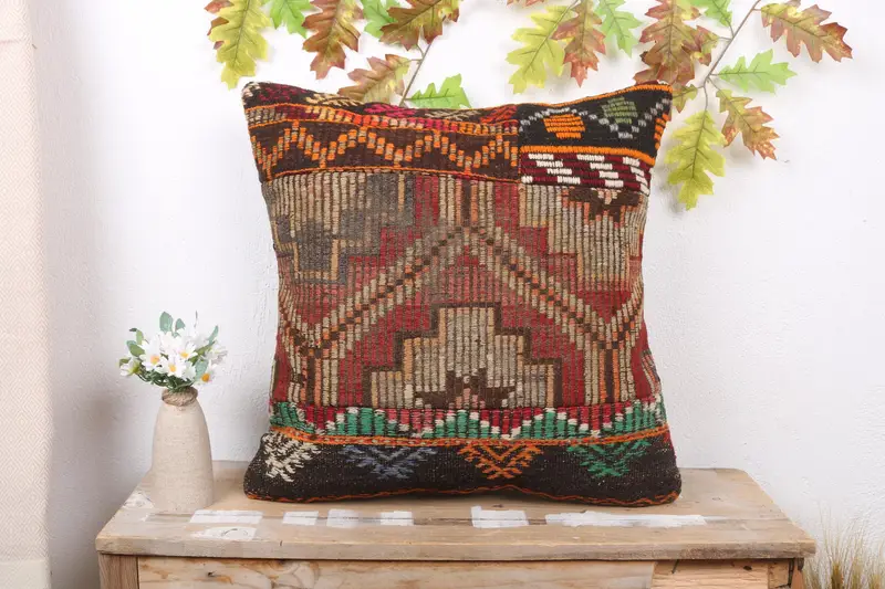 レッド&オレンジ刺繍パッチワーククッション、手作りヴィンテージ枕