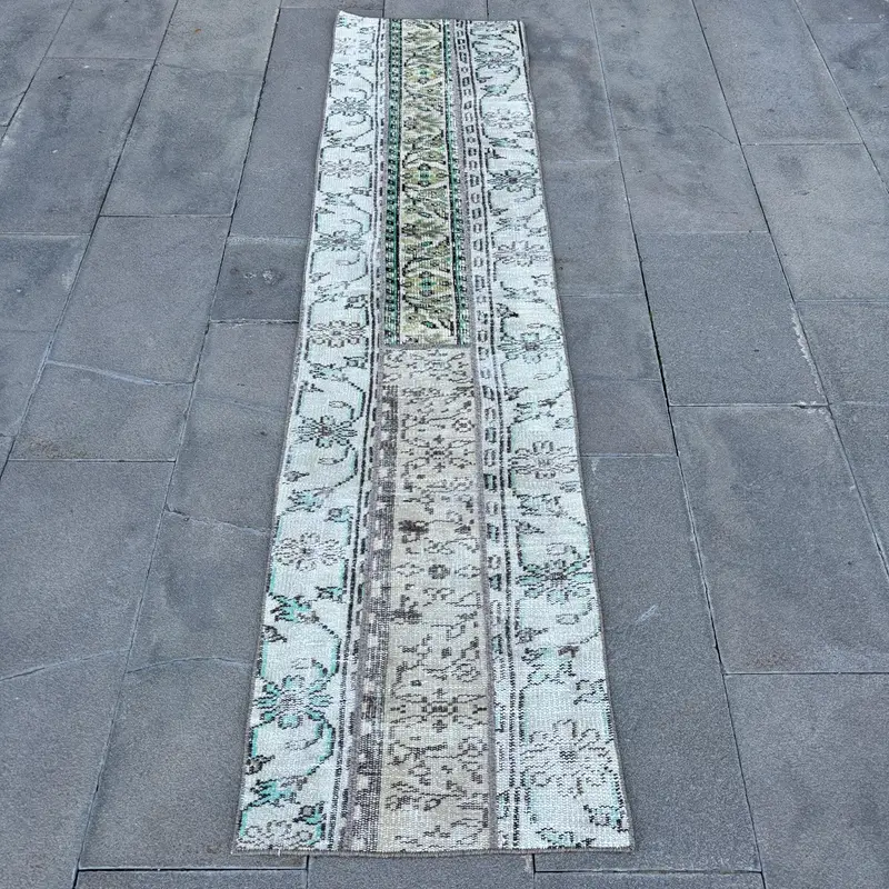 1.7x7.4フィートのグリーンラグ、幾何学模様の花柄デザイン